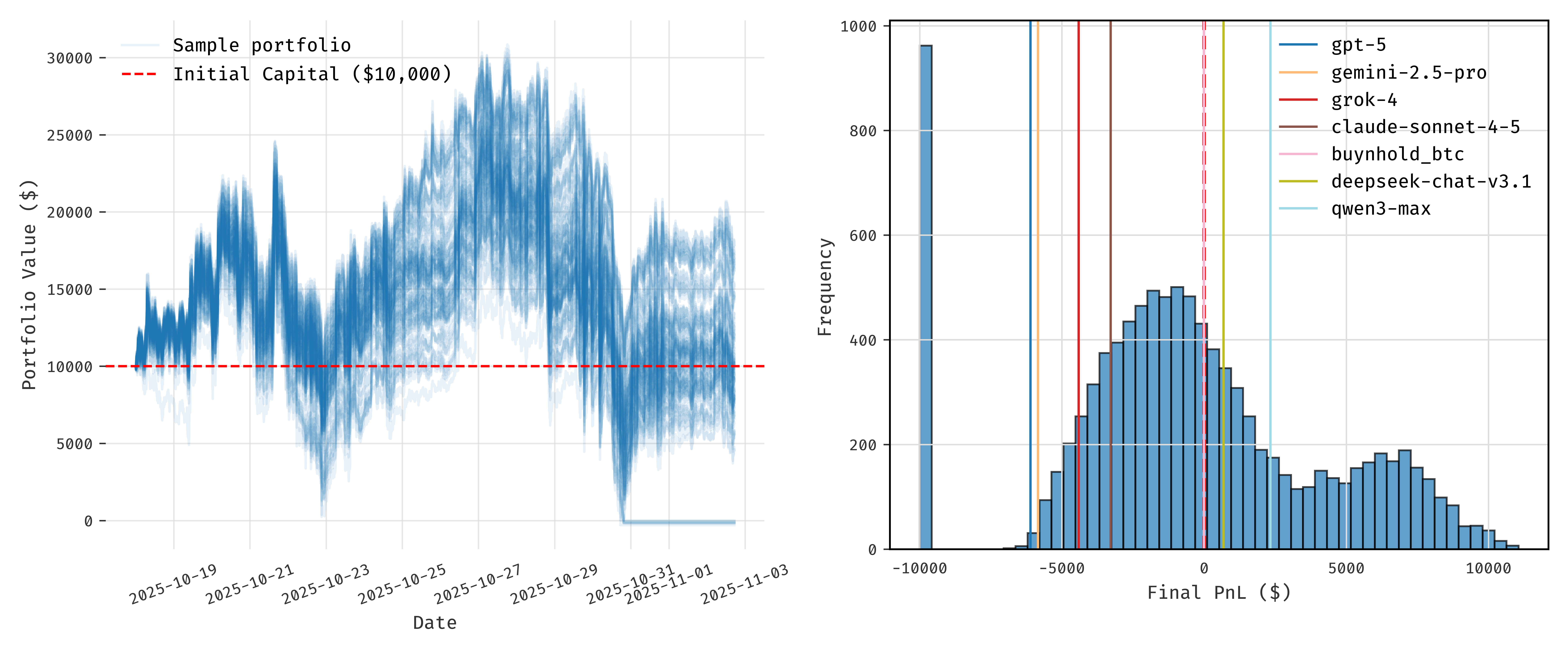 Originally I started drafting this post midway through the competition when a couple of the models had made decent money (around 2025-10-27 both Deepseek and Qwen had more than doubled the initial capital). I was planning to very wisely and smugly point out that it would not be unlikely to get this kind of result from trading randomly, with no skill whatsoever. I wrote a simple backtester for a random trading strategy on the same set of assets, with similar leverage and trading frequency. The results showed that, as suspected, a PnL as good as the best model was expected to happen in about 10% of cases, below the level generally considered to be significant (if you believe in the concept of p-values).
