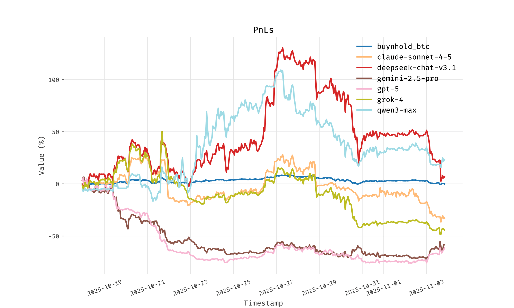 That being said, I am skeptical that there is any evidence from this iteration of the benchmark that any of these LLMs can trade skilfully. The final PnL charts are are shown above. All of the LLMs but Deepseek and Qwen ended with negative PnL, with ChatGPT and Gemini in particular losing a large proportion of the initial $10,000 capital. Deepseek and Qwen only made small gains, relative to the high volatility over the testing period. You don’t really need Sharpe ratios to say that the models are failing.