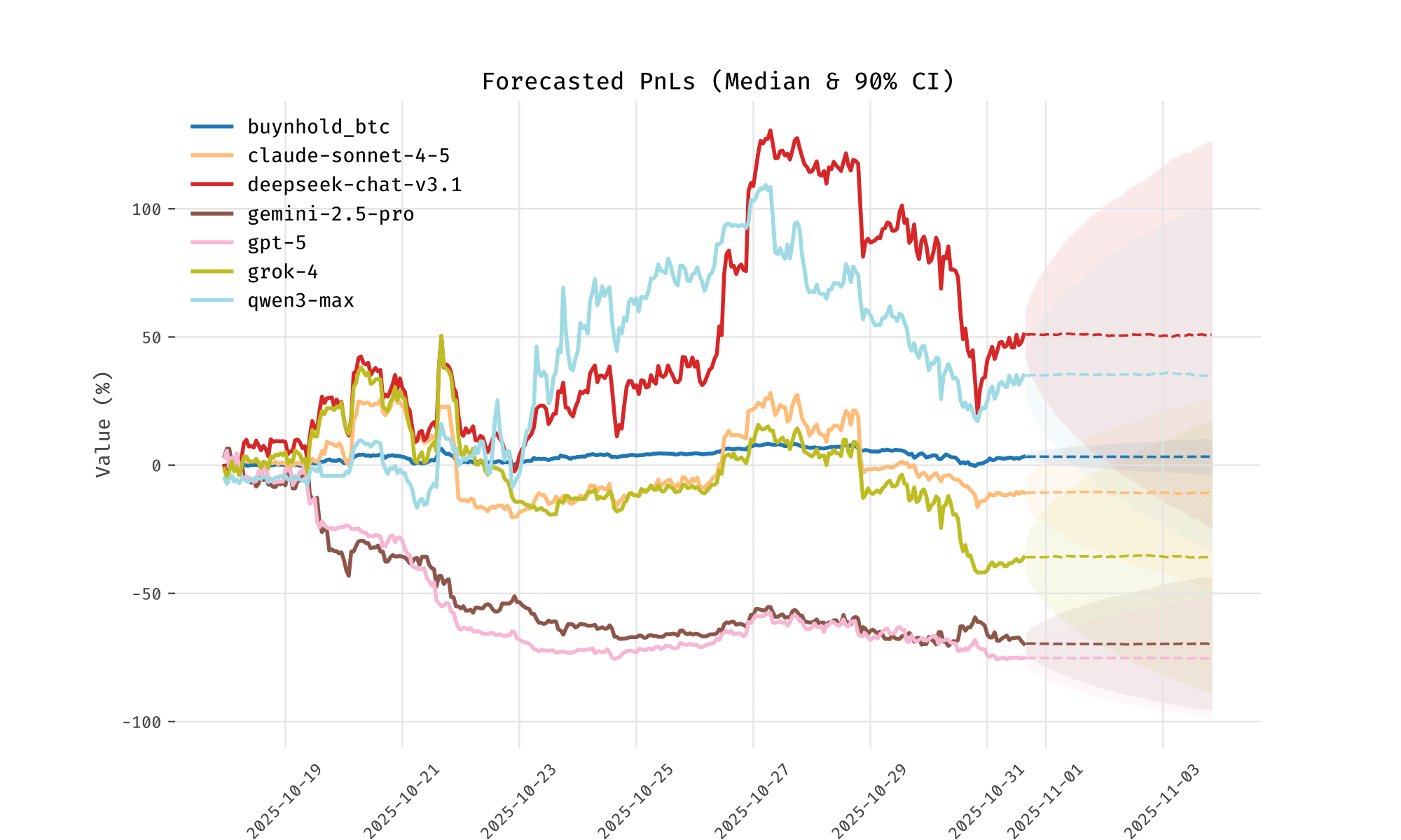In the sick, broken world that we live in, it was actually possible to trade the outcomes of this experiment on Polymarket, who provided markets on “Biggest winner”, “Biggest loser” and “Will anyone hit 50k?”.2 Whilst the competition was ongoing I used a simple exponential smoothing model to predict paths for the PnLs up until the end of the competition, and determine the probability of each model losing. On the 2025-10-31, the chance of Grok losing was priced at 1 cent (implying 1% chance), whereas my model said there was about a 9% chance. I ploughed the princely sum of 1 USDC into Grok “Yes” tokens, with a potential payout of $100. Unfortunately it didn’t go my way and I lost the cash, making this blog post much less good, and smug, in the process. The forecasts are below. You can make up your own mind as to whether this was a good bet or not.